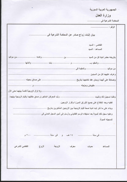Bescheinigung über die Eintragung einer Ehe durch das Scharia-Gericht (SYR) بيان اثبات زواج صادر عن المحكمة الشرعية